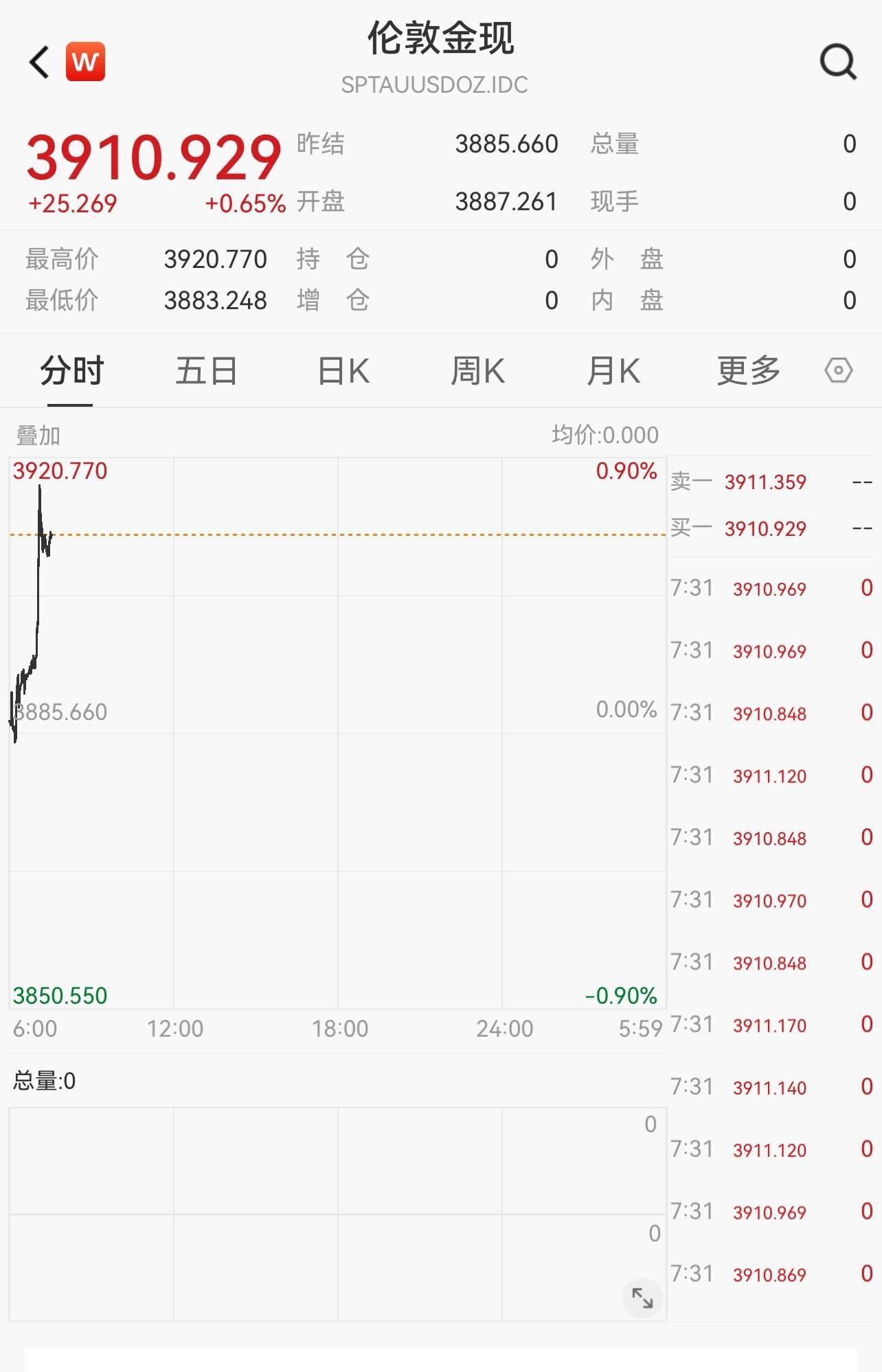 上证报中国证券网讯 北京时间10月6日7时31分,伦敦现货黄金价格突破每盎司3900美元,报每盎司3910.929美元,最高触及每盎司3920.77美元,再创历史新高。