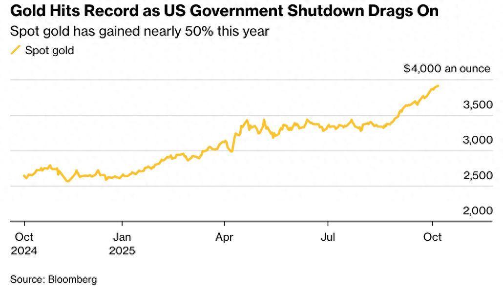 智通财经APP获悉,由于美国政府持续关门带来的不确定性加剧以及降息预期升温,黄金价格周一再创新高。黄金现货一度涨近1%,最高升至3920.77美元/盎司,再创历史新高。黄金期货同样走强,最高升至3945.2美元/盎司,创历史新高。数据显示,黄金今年迄今已累计上涨近50%。